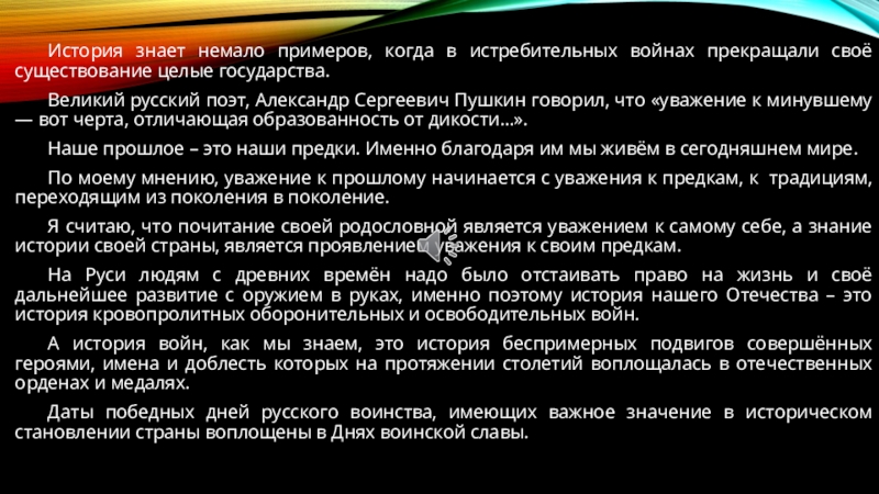 Великий русский поэт, Александр Сергеевич Пушкин говорил, что «уважение к минувшему — вот черта, отличающая образованность от дикости…».