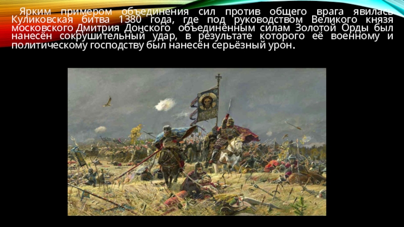 Слайд 6Ярким примером объединения сил против общего врага явилась Куликовская битва 1380