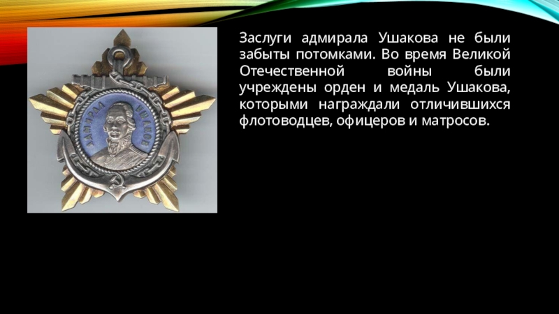 Слайд 14Заслуги адмирала Ушакова не были забыты потомками. Во время Великой Отечественной