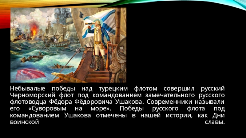 замечательного русского флотоводца Фёдора Фёдоровича Ушакова. Современники называли его «Суворовым на море». Победы русского флота под командованием Ушакова отмечены в нашей истории, как Дни воинской славы.
