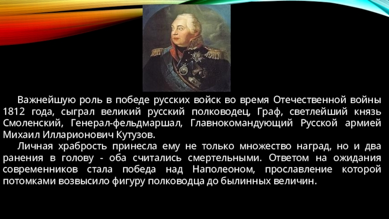 года, сыграл великий русский полководец, Граф, светлейший князь Смоленский, Генерал-фельдмаршал, Главнокомандующий Русской армией Михаил Илларионович Кутузов.