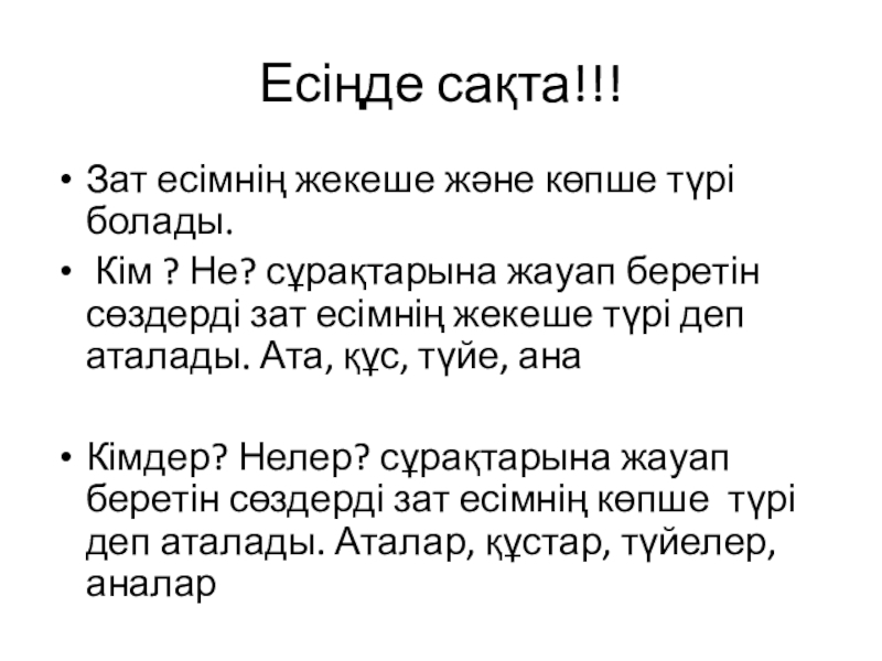 Есіңде сақта!!!Зат есімнің жекеше және көпше түрі болады. Кім ? Не? сұрақтарына жауап беретін сөздерді зат есімнің