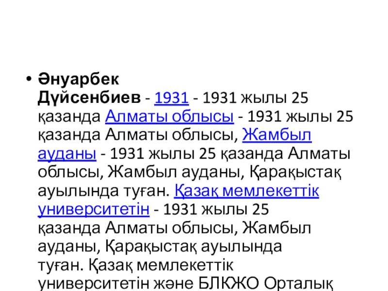 Әнуарбек Дүйсенбиев - 1931 - 1931 жылы 25 қазанда Алматы облысы - 1931 жылы 25 қазанда Алматы облысы, Жамбыл ауданы - 1931 жылы 25 қазанда Алматы