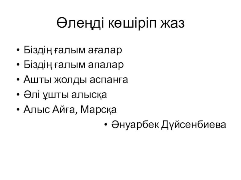 Өлеңді көшіріп жазБіздің ғалым ағаларБіздің ғалым апаларАшты жолды аспанғаӘлі ұшты алысқаАлыс Айға, МарсқаӘнуарбек Дүйсенбиева