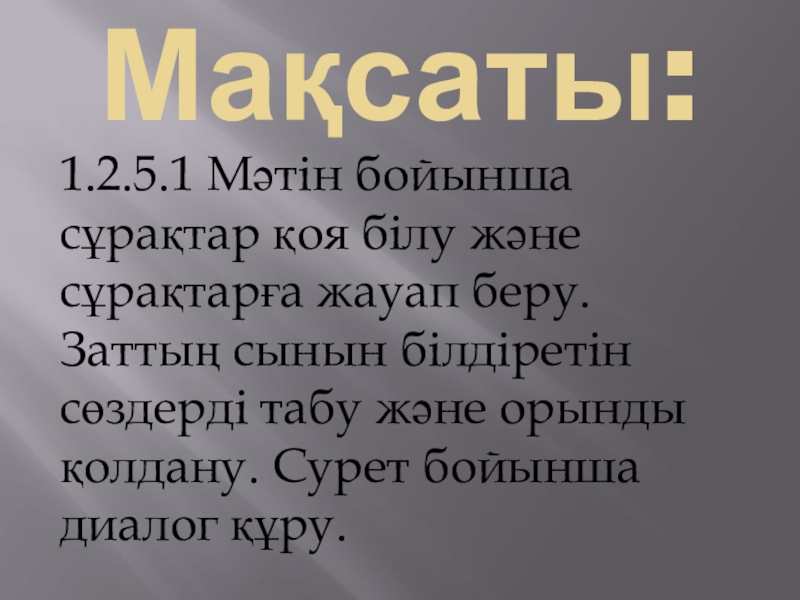 Мақсаты: 1.2.5.1 Мәтін бойынша сұрақтар қоя білу және сұрақтарға жауап беру. Заттың сынын білдіретін сөздерді табу және