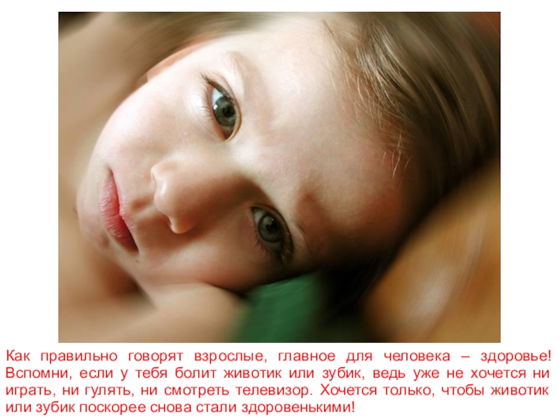 у тебя болит животик или зубик, ведь уже не хочется ни играть, ни гулять, ни смотреть телевизор. Хочется только, чтобы животик или зубик поскорее снова стали здоровенькими!