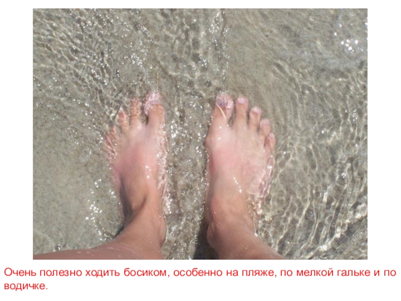 Слайд 42Очень полезно ходить босиком, особенно на пляже, по мелкой гальке и