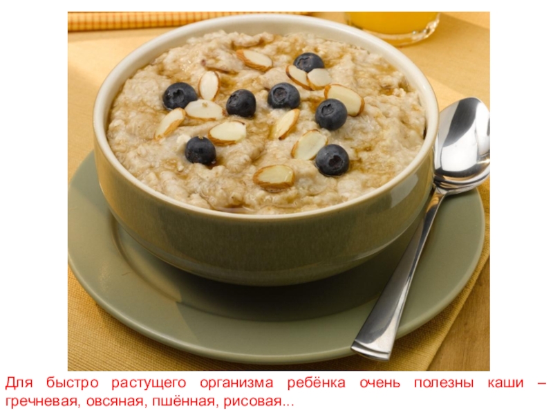 Слайд 26Для быстро растущего организма ребёнка очень полезны каши – гречневая, овсяная,