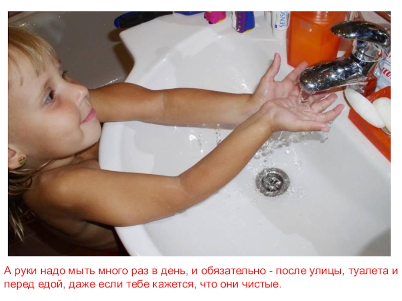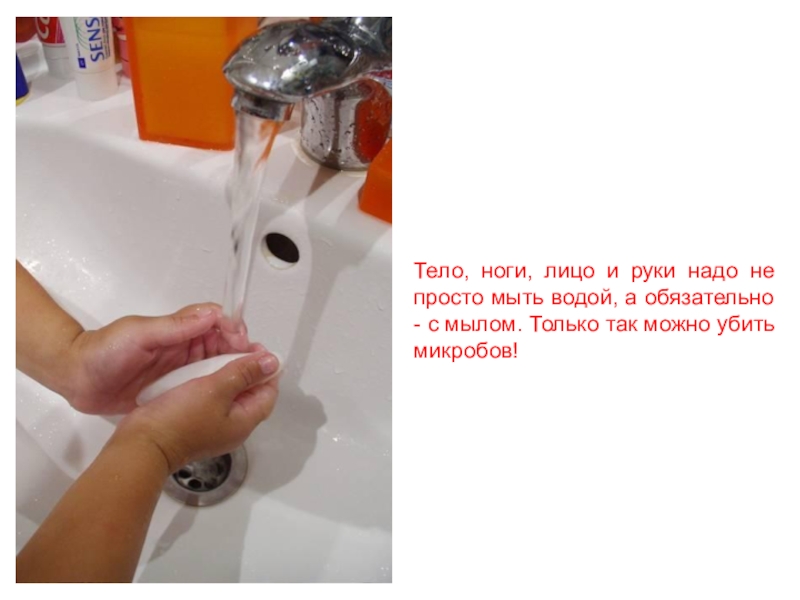Слайд 17Тело, ноги, лицо и руки надо не просто мыть водой, а
