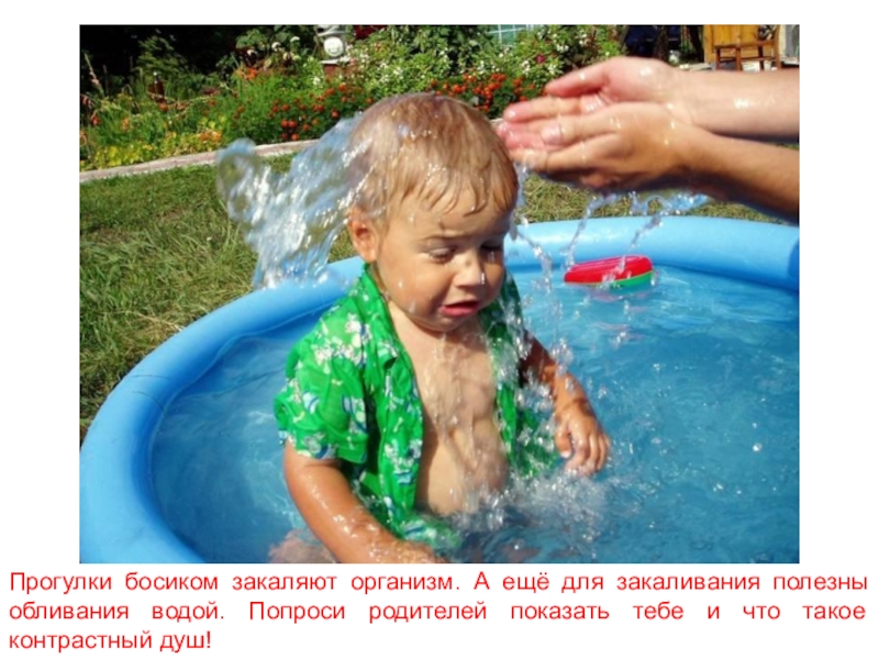 Слайд 44Прогулки босиком закаляют организм. А ещё для закаливания полезны обливания водой.
