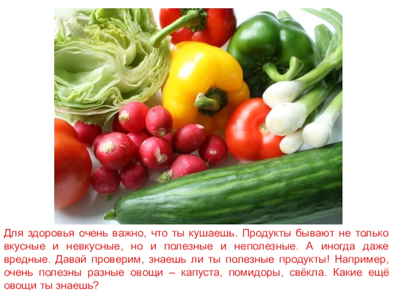 вкусные и невкусные, но и полезные и неполезные. А иногда даже вредные. Давай проверим, знаешь ли ты полезные продукты! Например, очень полезны разные овощи – капуста, помидоры, свёкла. Какие ещё овощи ты знаешь?