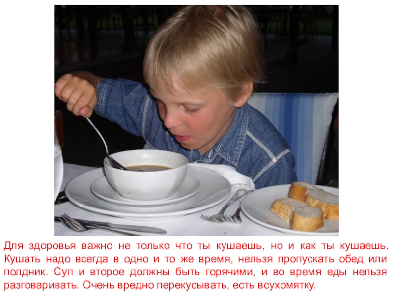 ты кушаешь. Кушать надо всегда в одно и то же время, нельзя пропускать обед или полдник. Суп и второе должны быть горячими, и во время еды нельзя разговаривать. Очень вредно перекусывать, есть всухомятку.