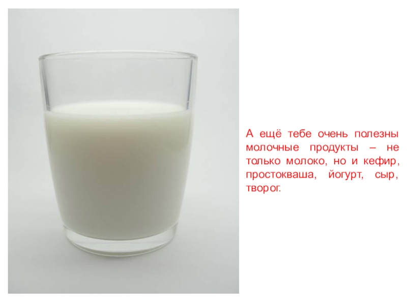 Слайд 27А ещё тебе очень полезны молочные продукты – не только молоко,