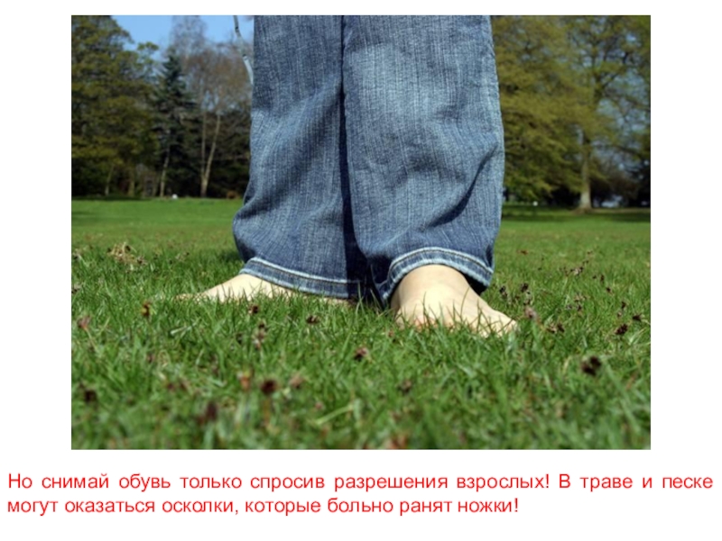 Слайд 43Но снимай обувь только спросив разрешения взрослых! В траве и песке