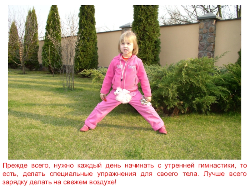 Слайд 6Прежде всего, нужно каждый день начинать с утренней гимнастики, то есть,