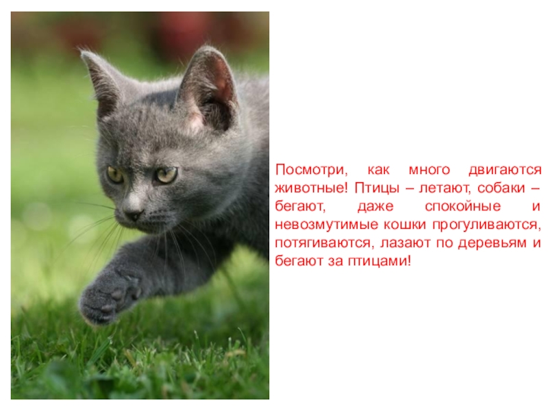 Слайд 7Посмотри, как много двигаются животные! Птицы – летают, собаки – бегают,