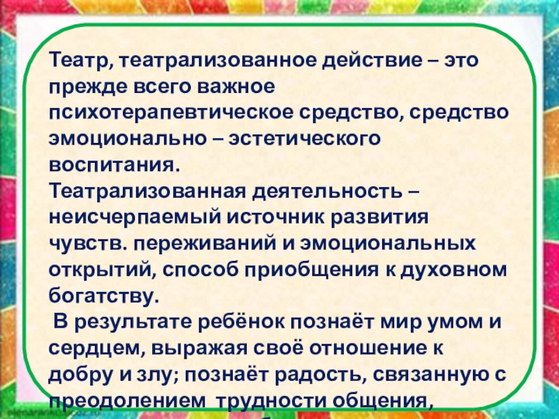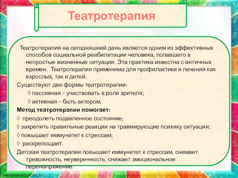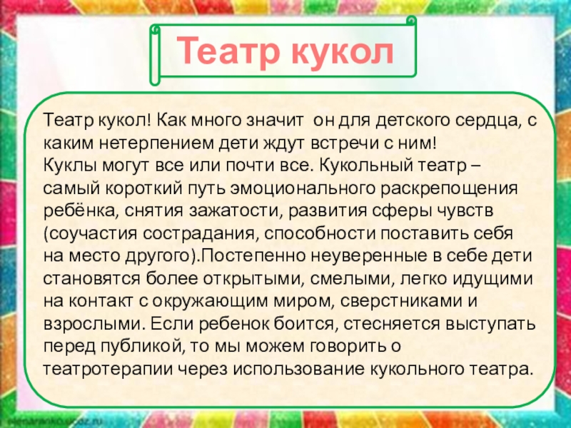 Куклы могут все или почти все. Кукольный театр – самый короткий путь эмоционального раскрепощения ребёнка, снятия зажатости, развития сферы чувств (соучастия сострадания, способности поставить себя на место другого).Постепенно неуверенные в себе дети становятся более открытыми, смелыми, легко идущими на контакт с окружающим миром, сверстниками и взрослыми. Если ребенок боится, стесняется выступать перед публикой, то мы можем говорить о театротерапии через использование кукольного театра.
