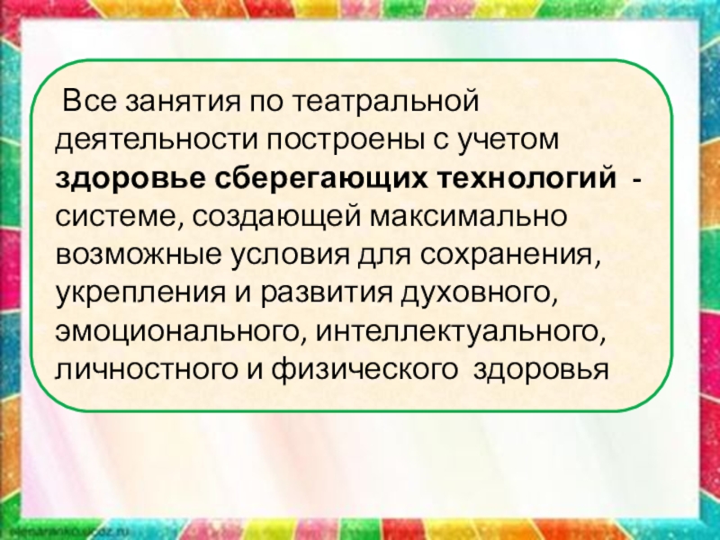 Все занятия по театральной деятельности построены с учетом здоровье сберегающих технологий - системе, создающей максимально возможные условия для сохранения, укрепления и развития духовного, эмоционального, интеллектуального, личностного и физического здоровья