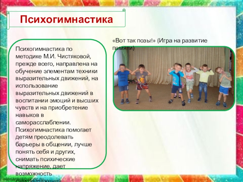 Психогимнастика помогает детям преодолевать барьеры в общении, лучше понять себя и других, снимать психические напряжение, дает возможность самовыражения.