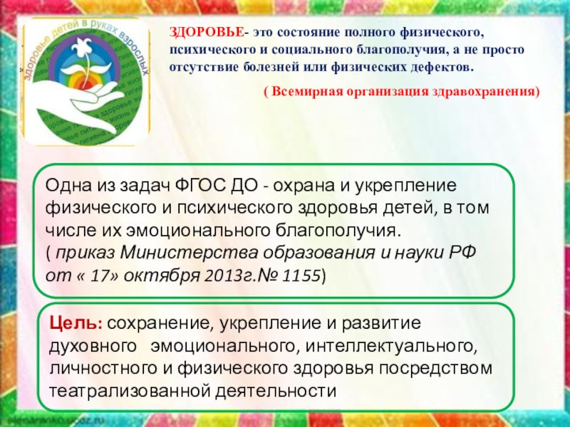 Цель: сохранение, укрепление и развитие духовного эмоционального, интеллектуального, личностного и физического здоровья посредством театрализованной деятельности