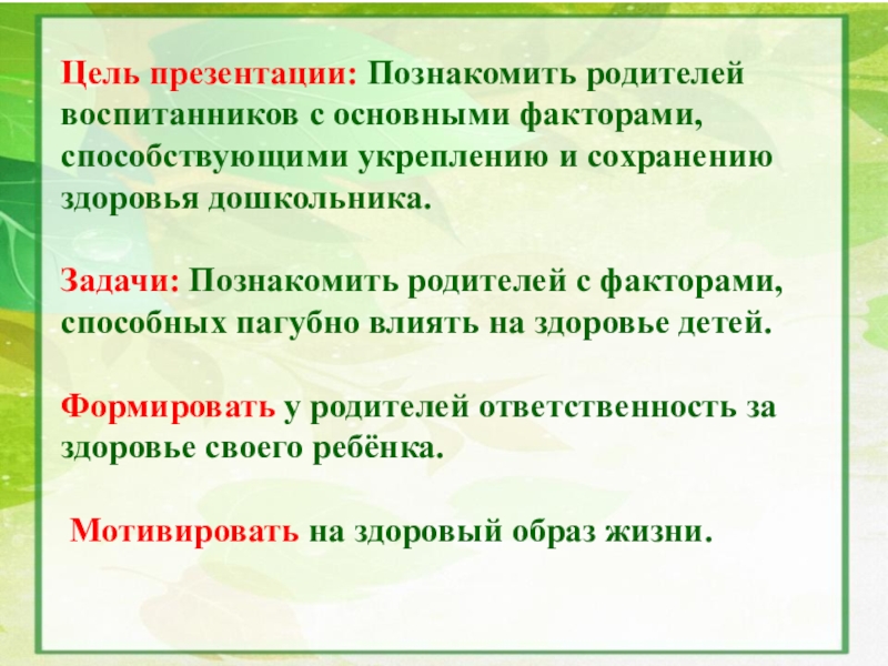 Цель презентации: Познакомить родителей воспитанников с основными факторами, способствующими укреплению и сохранению здоровья дошкольника. Задачи: Познакомить родителей с факторами, способных пагубно влиять на здоровье детей. Формировать у родителей ответственность за здоровье своего ребёнка. Мотивировать на здоровый