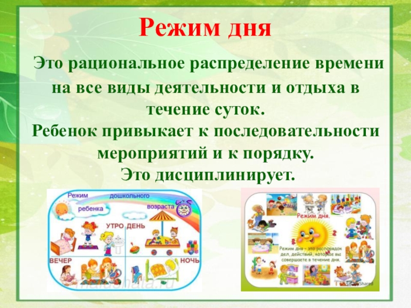 Режим дня Это рациональное распределение времени на все виды деятельности и отдыха в течение суток. Ребенок привыкает