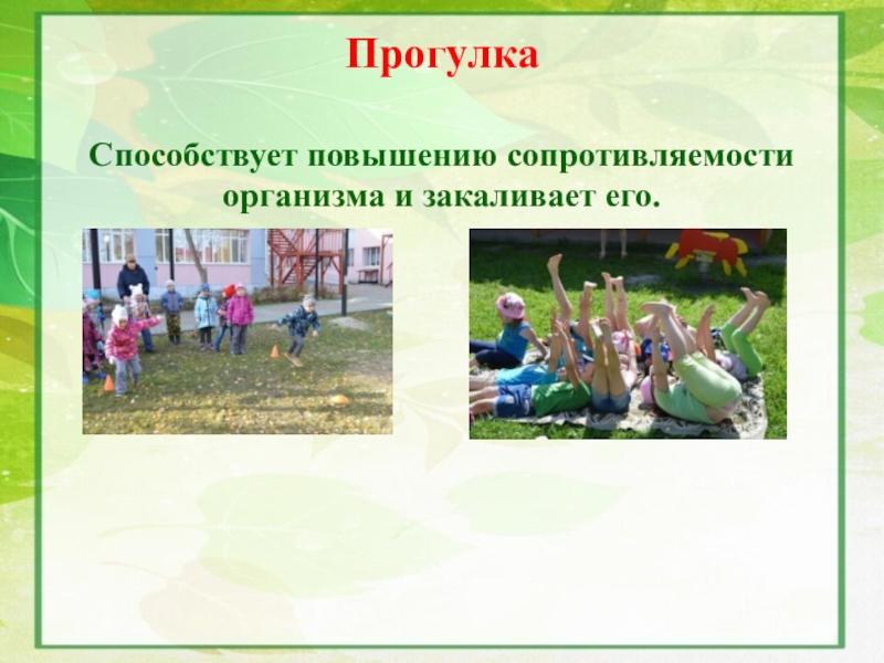 ПрогулкаСпособствует повышению сопротивляемости организма и закаливает его.