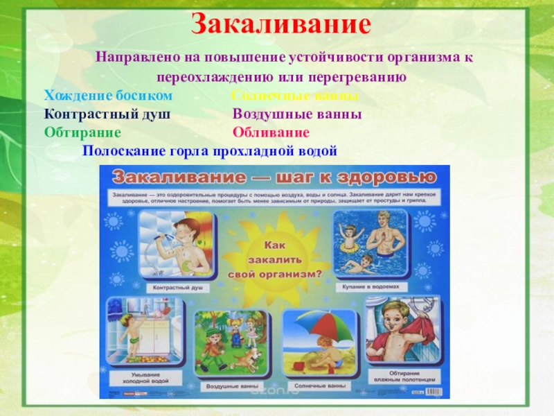 Закаливание Направлено на повышение устойчивости организма к переохлаждению или перегреванию Хождение босиком