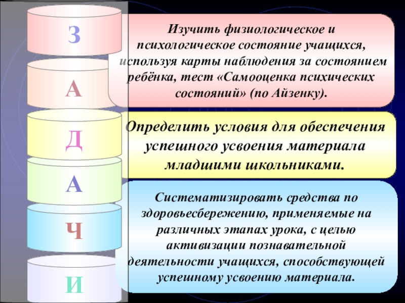 Изучить физиологическое и психологическое состояние учащихся, используя карты наблюдения за состоянием ребёнка, тест «Самооценка психических состояний» (по Айзенку).