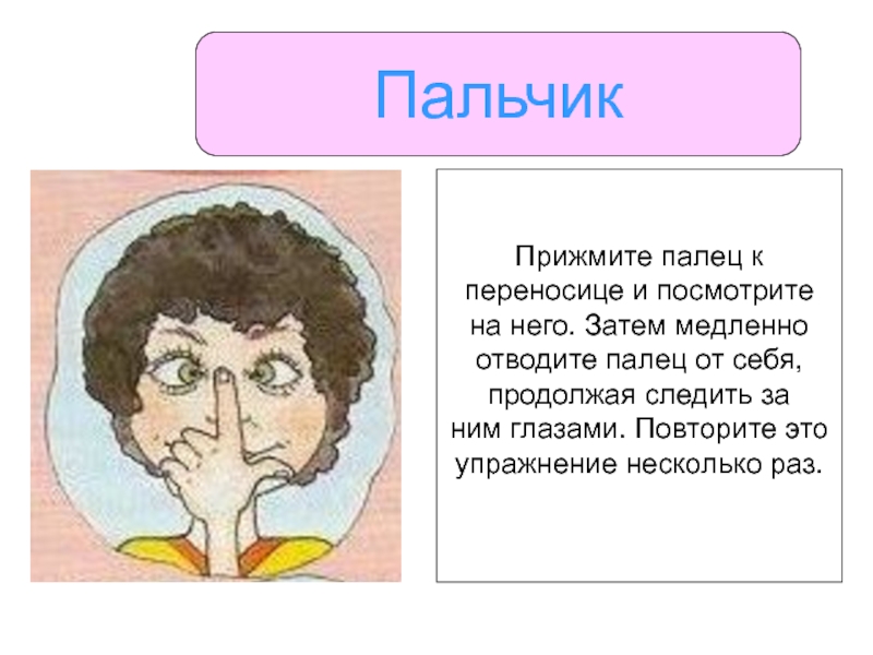 ПальчикПрижмите палец к переносице и посмотритена него. Затем медленноотводите палец от себя,продолжая следить за ним глазами. Повторите