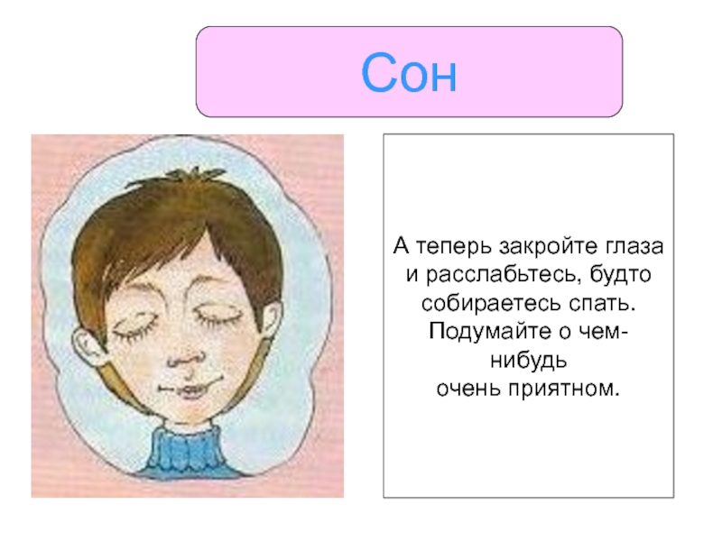 СонА теперь закройте глаза и расслабьтесь, будтособираетесь спать.Подумайте о чем-нибудьочень приятном.