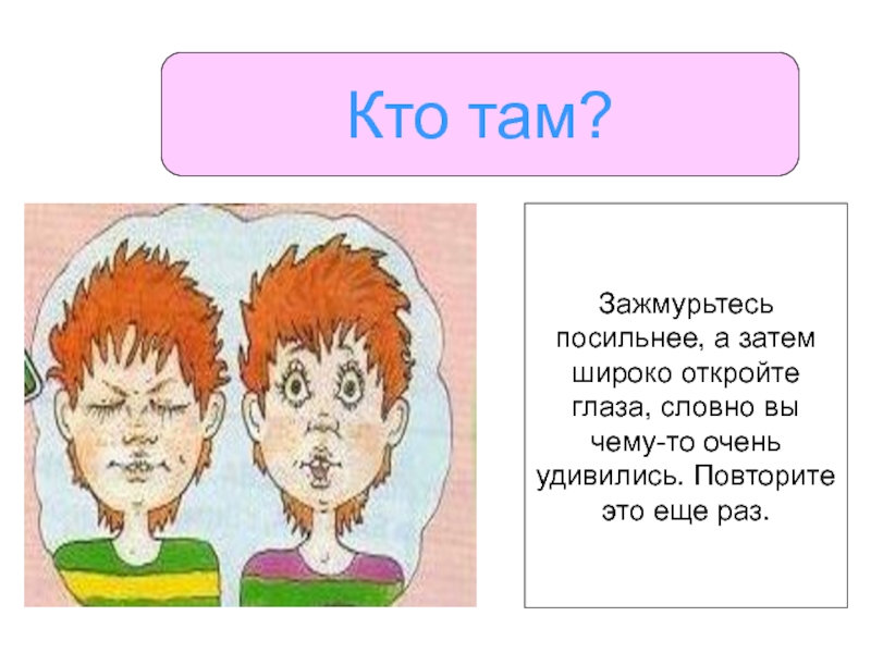 Кто там?Зажмурьтесьпосильнее, а затемшироко откройте глаза, словно вычему-то оченьудивились. Повторитеэто еще раз.