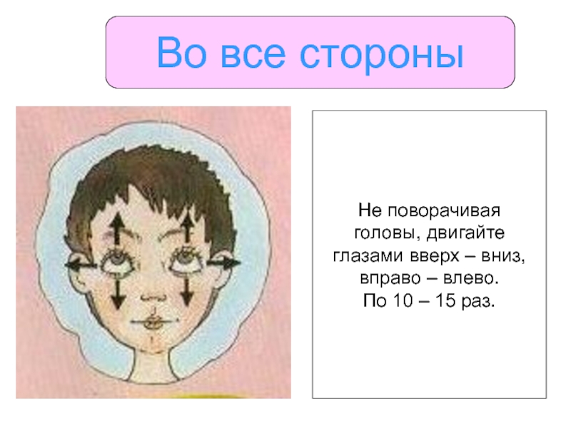 Во все стороныНе поворачивая головы, двигайте глазами вверх – вниз,вправо – влево. По 10 – 15 раз.