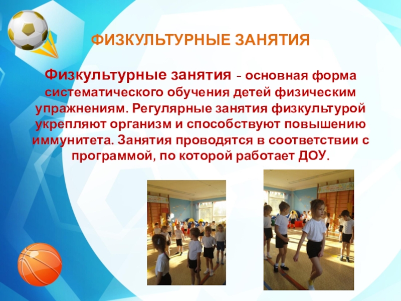 Физкультурные занятия - основная форма систематического обучения детей физическим упражнениям.