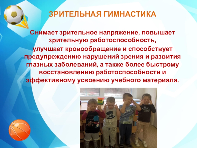 способствует предупреждению нарушений зрения и развития глазных заболеваний, а также более быстрому восстановлению работоспособности и эффективному усвоению учебного материала.