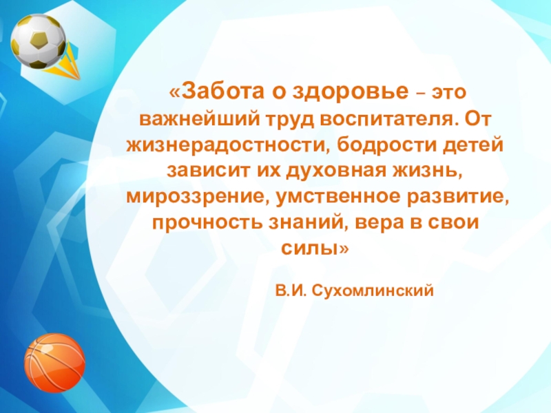 Слайд 3 «Забота о здоровье – это важнейший труд воспитателя. От жизнерадостности,