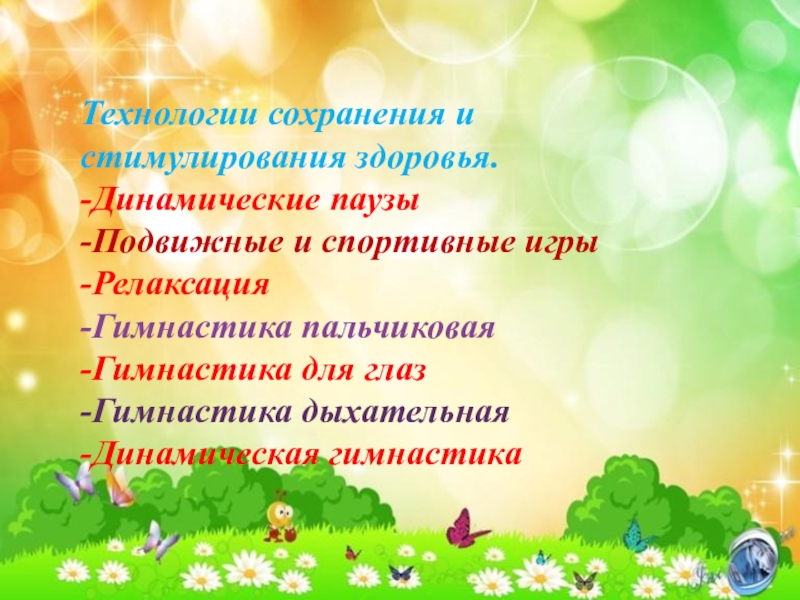 Технологии сохранения и стимулирования здоровья.-Динамические паузы -Подвижные и спортивные игры -Релаксация -Гимнастика пальчиковая -Гимнастика для глаз -Гимнастика