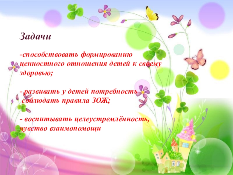 Задачи-способствовать формированию ценностного отношения детей к своему здоровью;- развивать у детей потребность соблюдать правила ЗОЖ;- воспитывать целеустремлённость,
