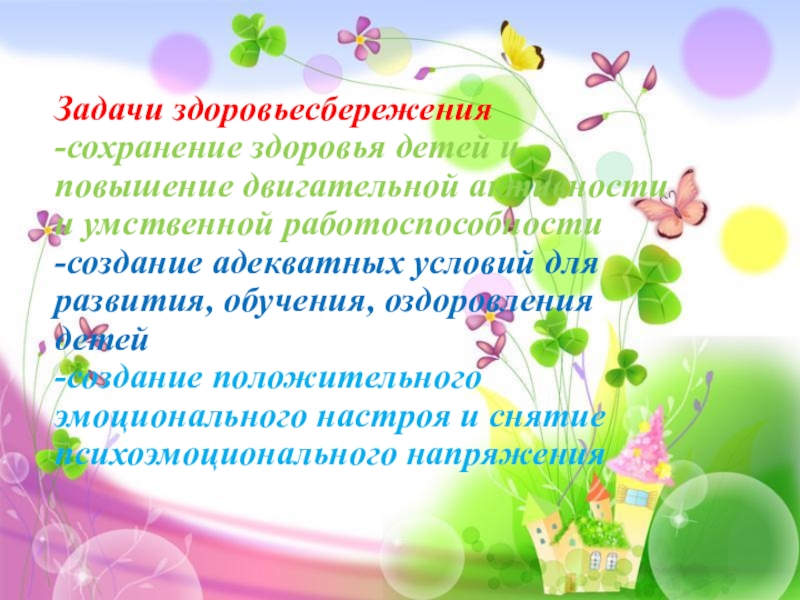 Задачи здоровьесбережения-сохранение здоровья детей и повышение двигательной активности и умственной работоспособности -создание адекватных условий для развития, обучения,