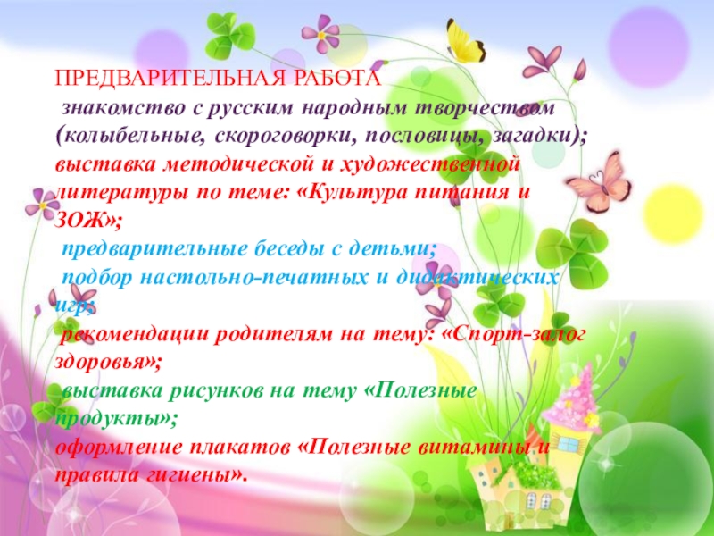 ПРЕДВАРИТЕЛЬНАЯ РАБОТА знакомство с русским народным творчеством (колыбельные, скороговорки, пословицы, загадки);выставка методической и художественной литературы по теме: