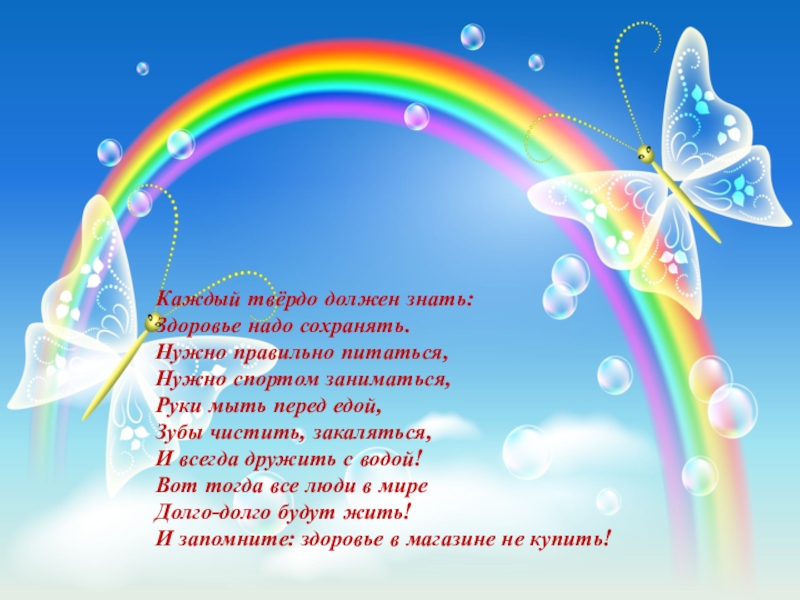 Каждый твёрдо должен знать:Здоровье надо сохранять.Нужно правильно питаться,Нужно спортом заниматься,Руки мыть перед едой,Зубы чистить,