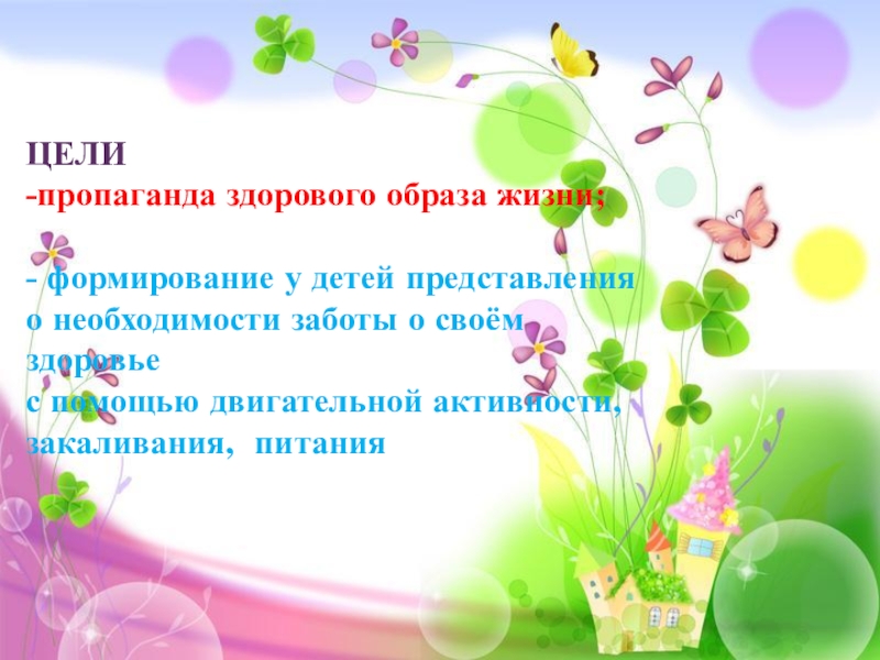 ЦЕЛИ-пропаганда здорового образа жизни;- формирование у детей представления о необходимости заботы о своём здоровьес помощью двигательной активности,