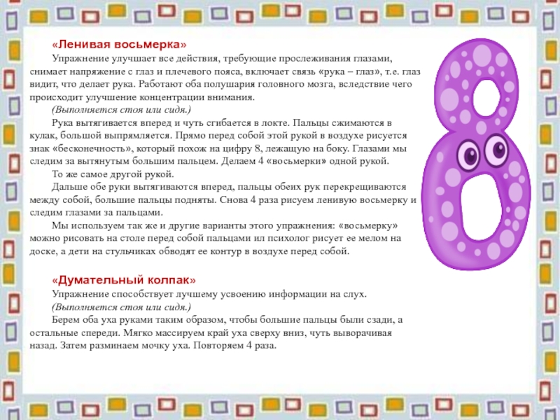 Мы используем так же и другие варианты этого упражнения: «восьмерку» можно рисовать на столе перед собой пальцами ил психолог рисует ее мелом на доске, а дети на стульчиках обводят ее контур в воздухе перед собой.