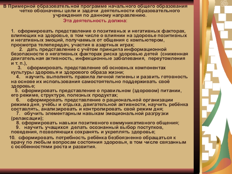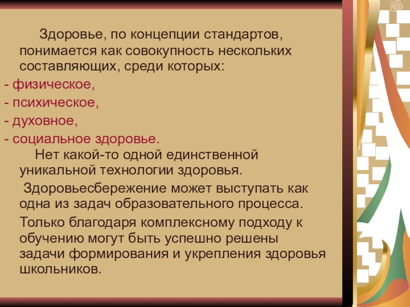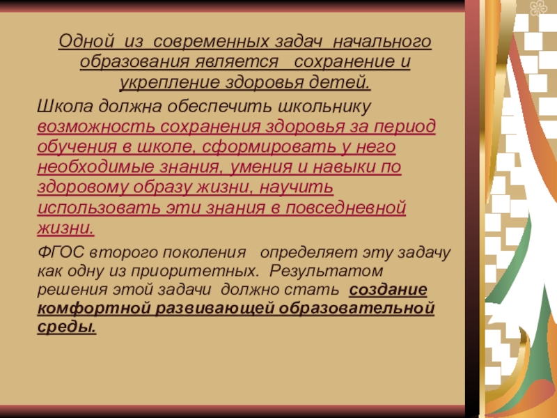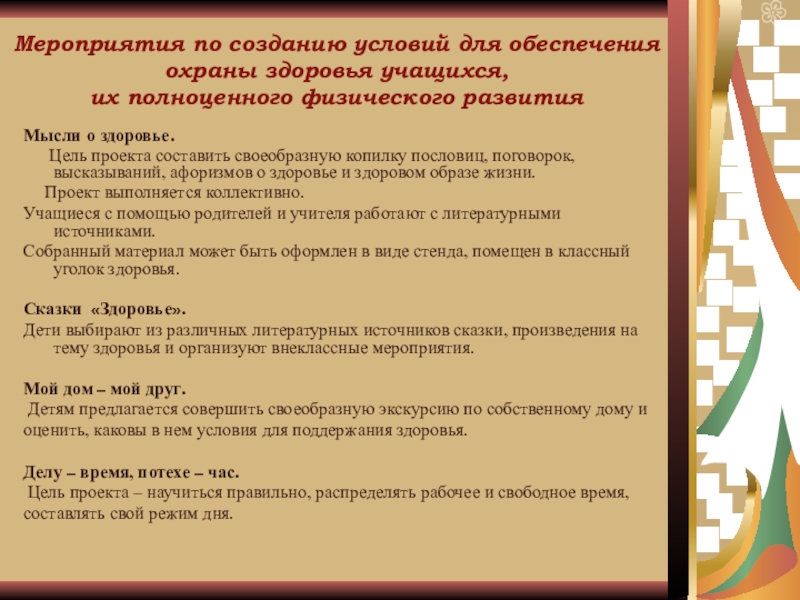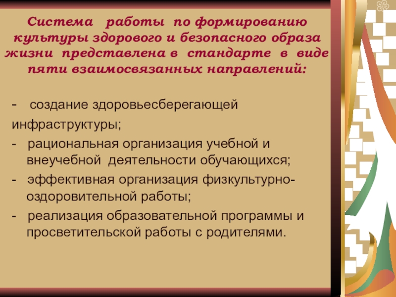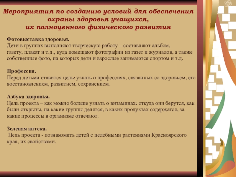 - создание здоровьесберегающей