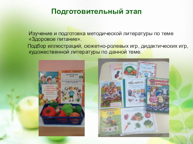 Подготовительный этап   Изучение и подготовка методической литературы по теме «Здоровое питание».  Подбор иллюстраций, сюжетно-ролевых