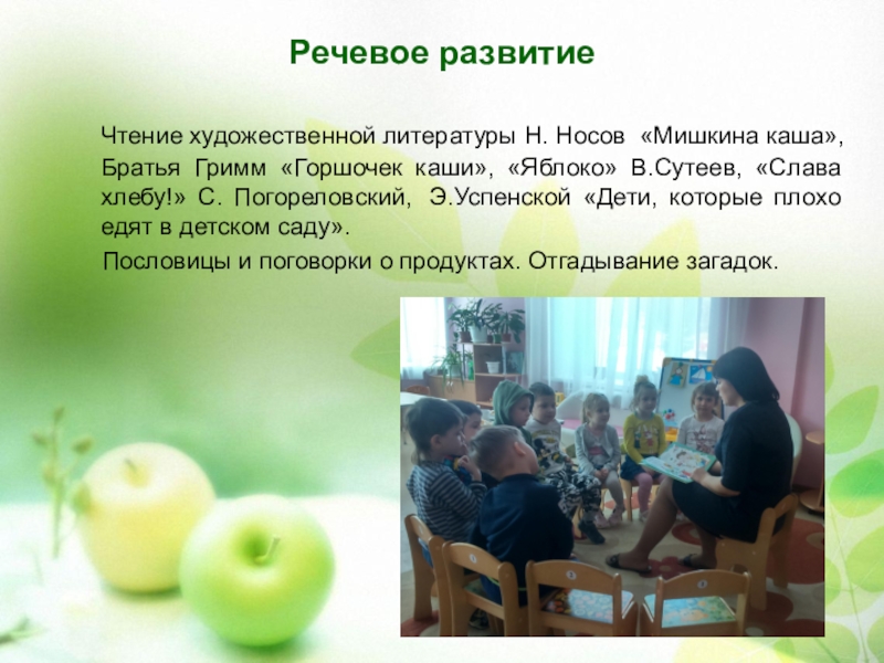 Гримм «Горшочек каши», «Яблоко» В.Сутеев, «Слава хлебу!» С. Погореловский,  Э.Успенской «Дети, которые плохо едят в детском саду».