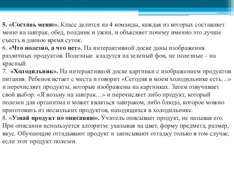 8. «Узнай продукт по описанию». Учитель описывает продукт, не называя его. При описании используется алгоритм: указывая на цвет, форму предмета, размер, вкус. Обучающие отгадывают продукт и записывают отгадку только в том случае, если этот продукт полезен.