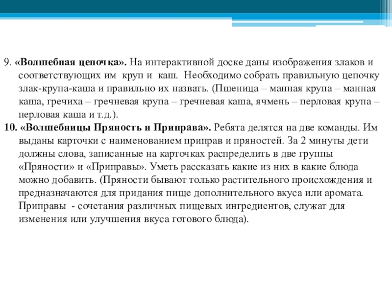 10. «Волшебницы Пряность и Приправа». Ребята делятся на две команды. Им выданы карточки с наименованием приправ и пряностей. За 2 минуты дети должны слова, записанные на карточках распределить в две группы «Пряности» и «Приправы». Уметь рассказать какие из них в какие блюда можно добавить. (Пряности бывают только растительного происхождения и предназначаются для придания пище дополнительного вкуса или аромата. Приправы - сочетания различных пищевых ингредиентов, служат для изменения или улучшения вкуса готового блюда).