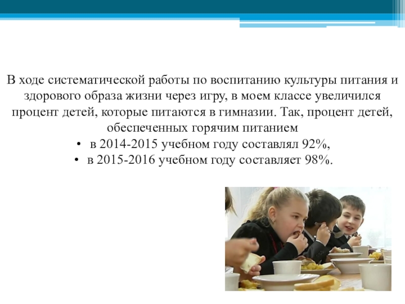 жизни через игру, в моем классе увеличился процент детей, которые питаются в гимназии. Так, процент детей, обеспеченных горячим питанием