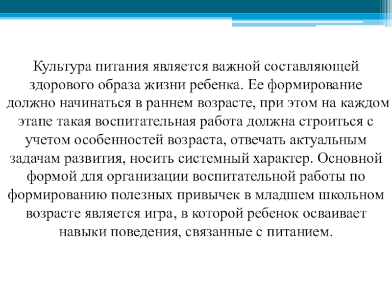 должно начинаться в раннем возрасте, при этом на каждом этапе такая воспитательная работа должна строиться с учетом особенностей возраста, отвечать актуальным задачам развития, носить системный характер. Основной формой для организации воспитательной работы по формированию полезных привычек в младшем школьном возрасте является игра, в которой ребенок осваивает навыки поведения, связанные с питанием.